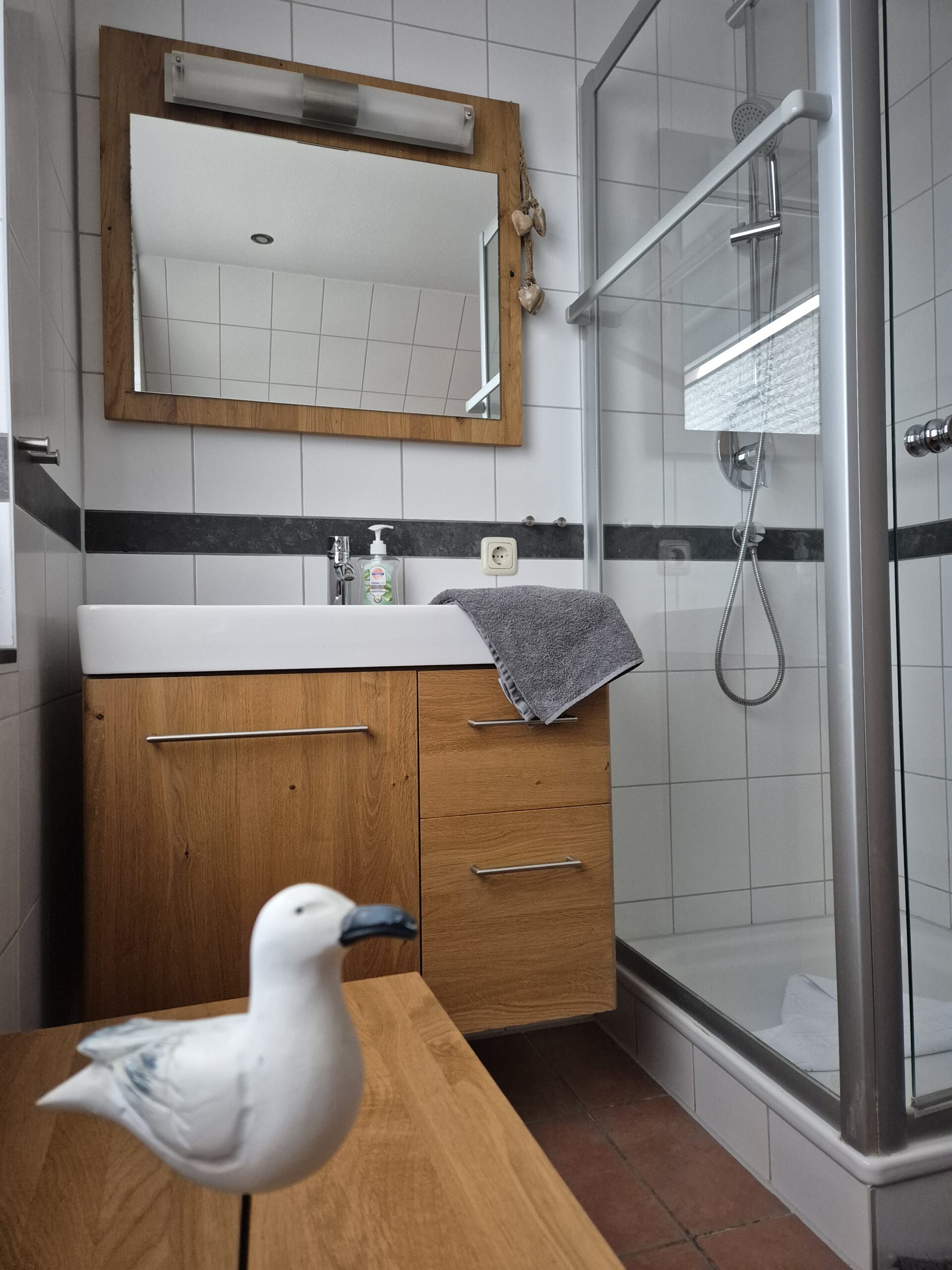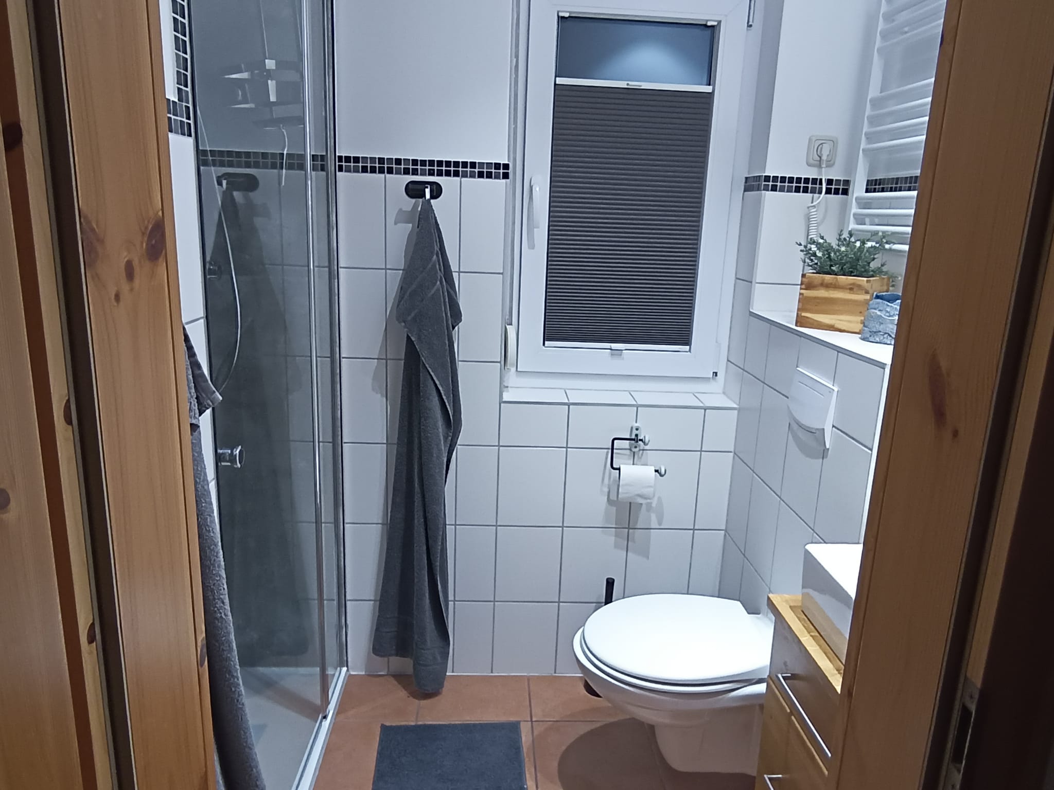 Begehbare Dusche, Toilette, Waschecken, Massivholzmöbel, Handtuchheizkörper, Fön, Starterset an Toilettenpapier. Fußbodenheizung, Fliegengitter
