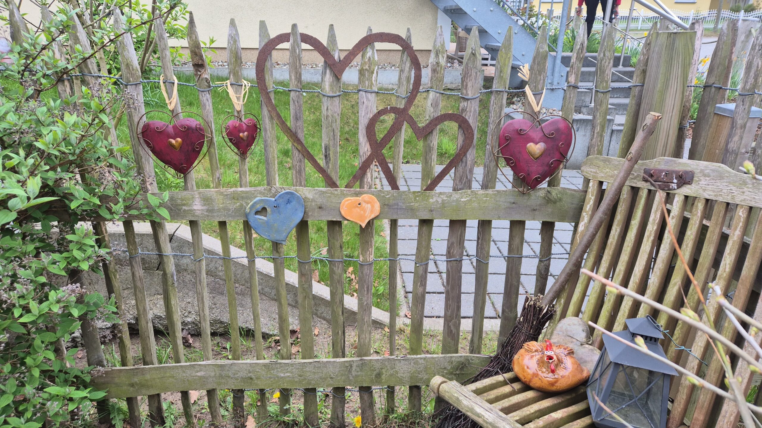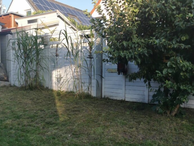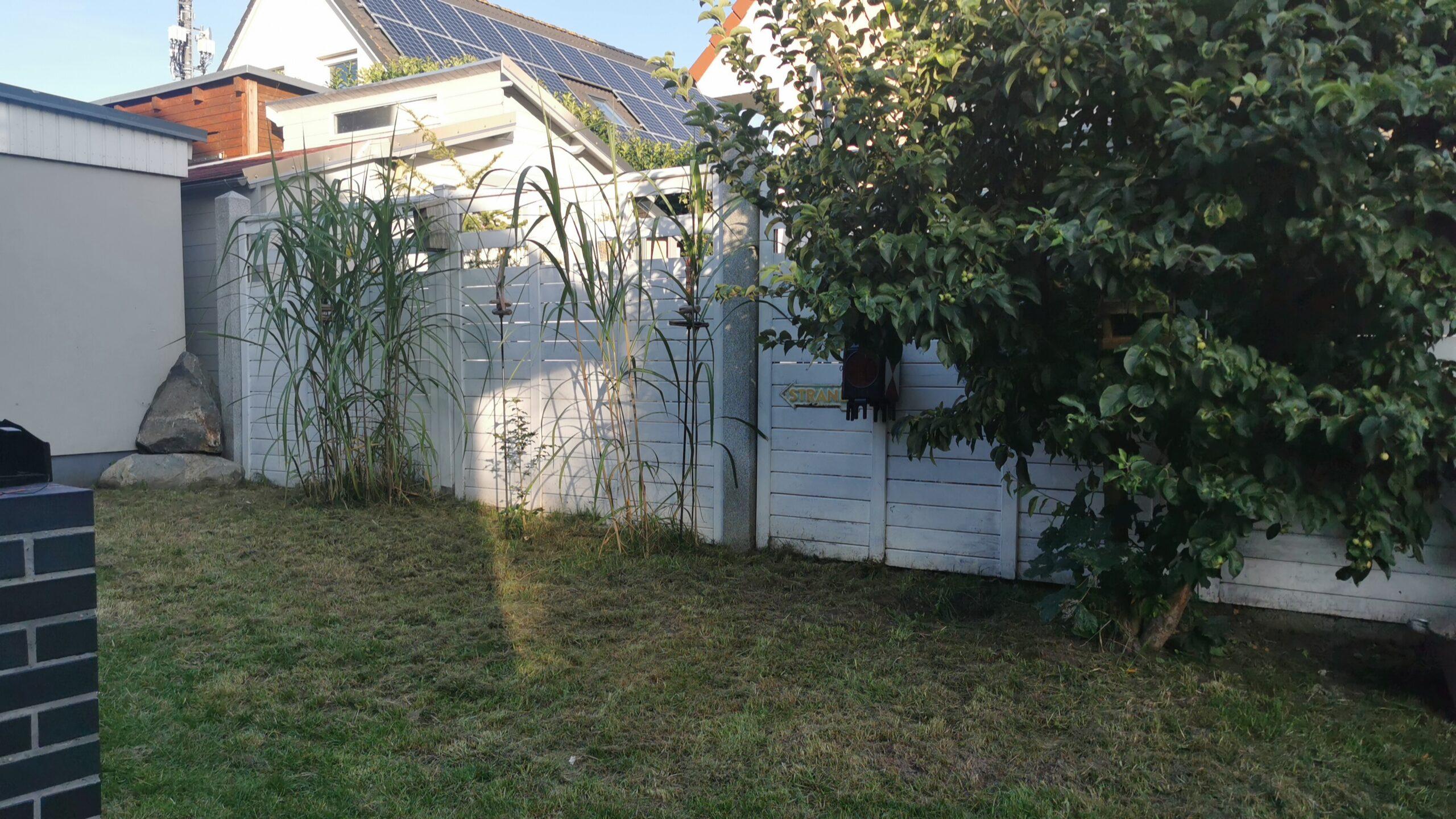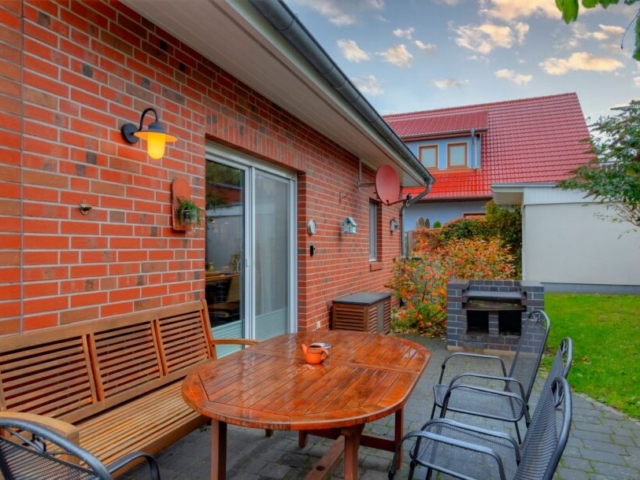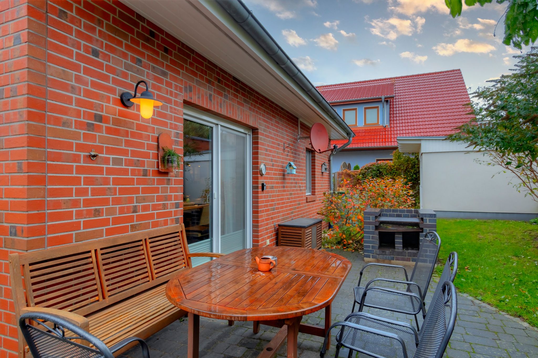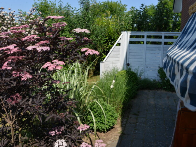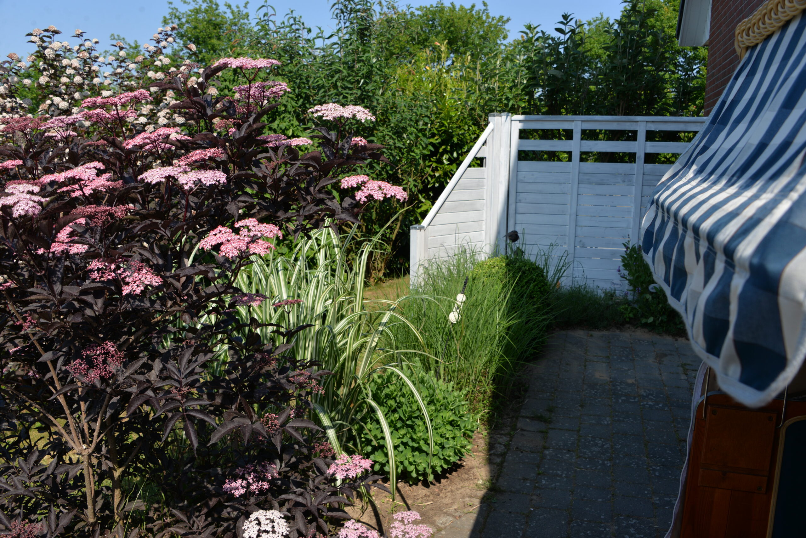Massivholzmöblierter Außenbereich mit Strandkorb, Marktschirm, Liegestuhl und gemauertem, großen Grill. Die Terrasse geht um zwei Seiten des Hauses. Der Garten ist im hinteren Bereich umzäunt. Im Gartenhaus können E-Bikes auf Anfrage eingeschlossen werden.