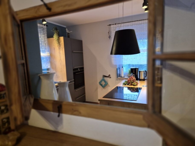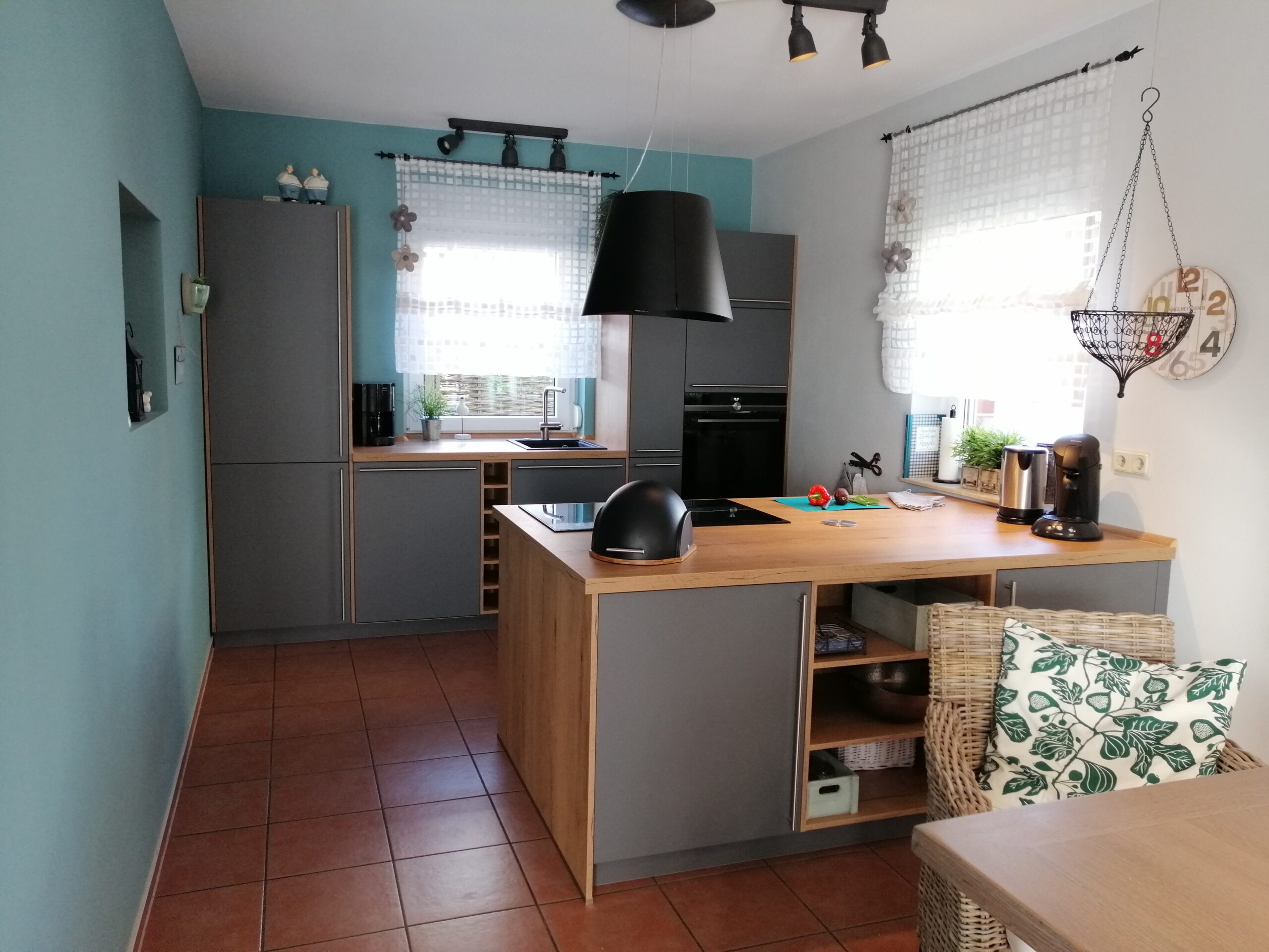 Komplett ausgestattete Küche mit Kühlschrank, Gefrierschrank, Kaffeevollautomat, Tab-Kaffee- und herkömlicher Kaffeemaschine, Toaster, Wasserkocher, Brotschneidemaschine, Spülmaschine, Backofen, Induktionskochplatte, Mixer, Pürierstab, komplettes Besteckfach mit allem Drum und Dran! Ein Fenster mit Fliegengitter.