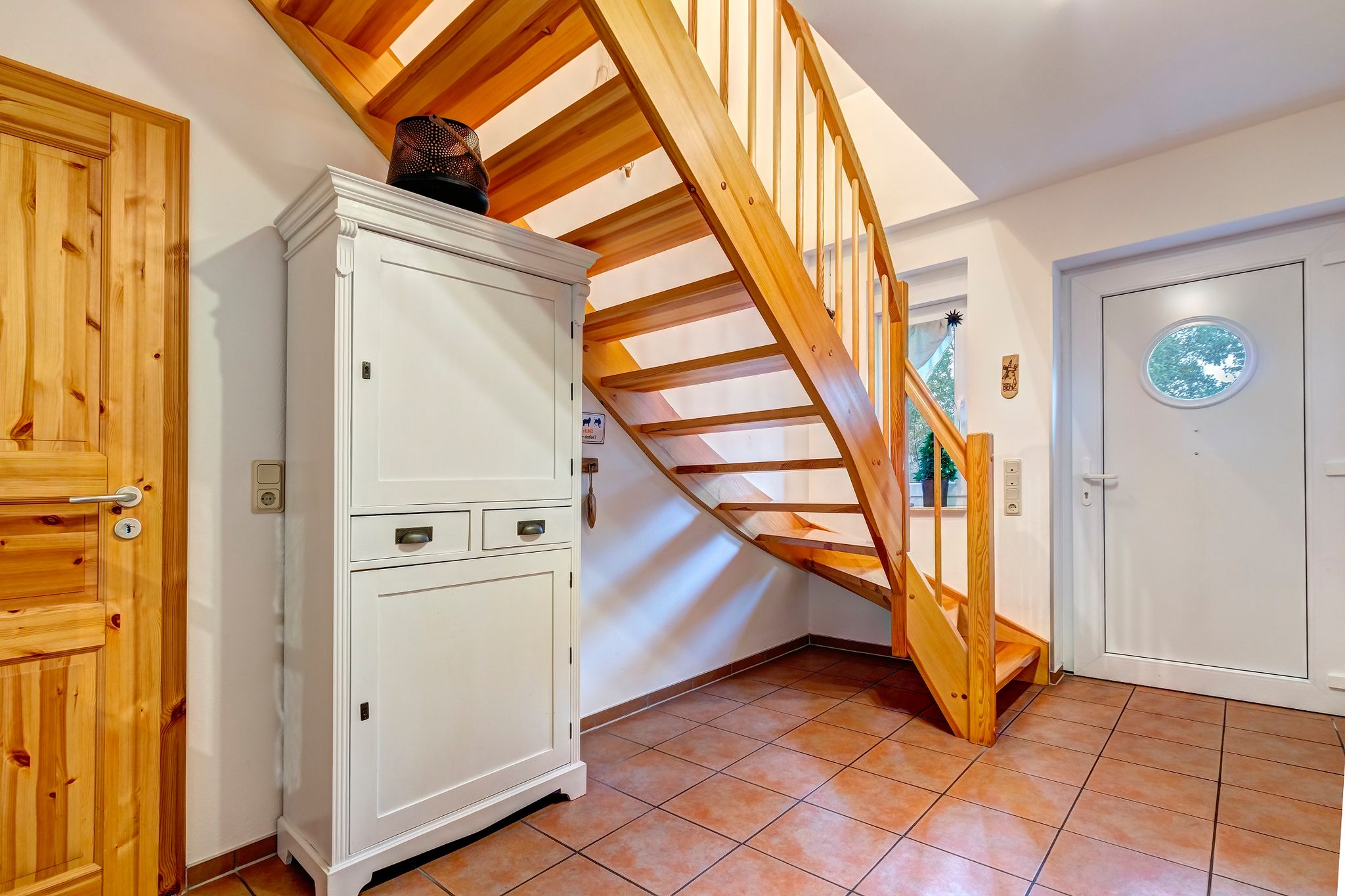 Geräumiger Eingangsbereich innen mit Garderobe und Schuhregal.