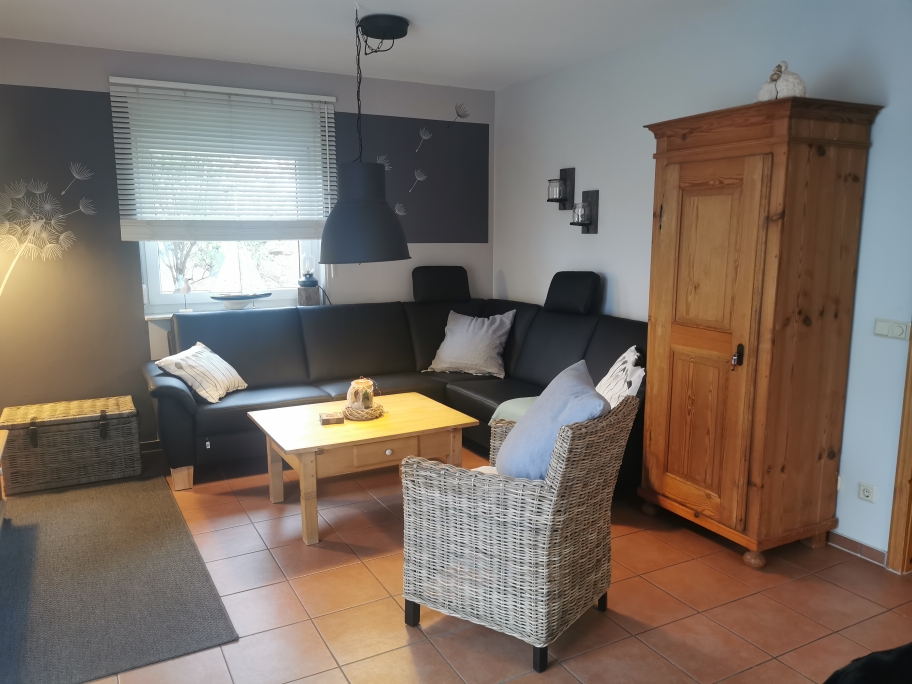 Massive Schreinermöbel für bequem 8 Personen. Ein alter DEKO-Bullerofen und dekorative Korbmöbel spenden Gemütlichkeit. Geschirr ist für 16 Personen vorhanden. Zwei Doppeltüren gehen auf die Terrassenseiten. Eine davon mit Fliegenschiebetür.