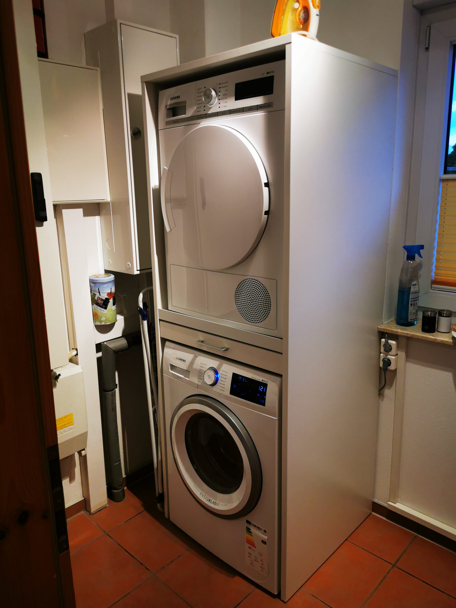 Waschmaschine und Trockner für die kleine Wäsche, Staubsauger, Besenset, Eimer, Wäscheständer, Bügeleisen. Fliegengitter.